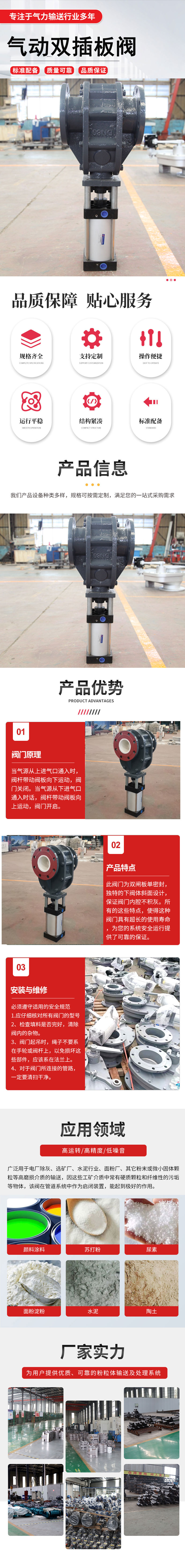 气动双插板阀是我厂生产的一种气动控制阀门,主要用于管道中物料的截断或流通控制,尤其适用于粉尘、颗粒状物料的输送系统。该阀门采用双插板结构,通过气动执行器驱动,具有结构简单、操作方便的特点,经过实际应用验证,能满足一般工业场景的启闭需求,适合对阀门密封性和操作效率有基础要求的企业选用。